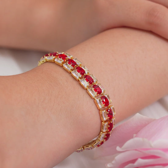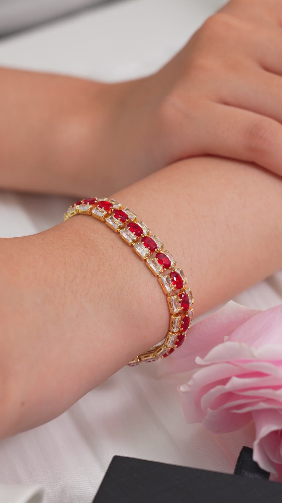 Featuring alternating red and clear crystals set in a radiant gold finish, this bracelet captures the perfect balance of fire and grace. The dual-tone design adds depth and sophistication, making it an effortless statement piece for both everyday wear and special occasions.
